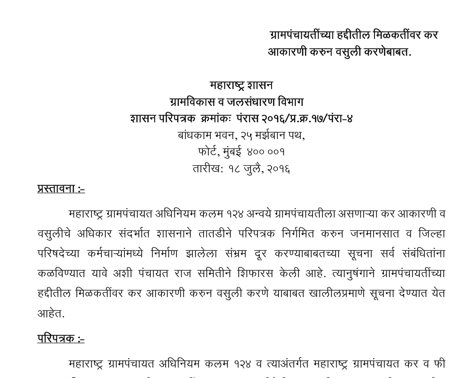 Gram Panchayat बाबत हि Blogs/website महाराष्ट्रातील स्थानिक पातळीवर, गाव विकासासाठी कटिबद्ध असलेल्या नि ग्रामपंचायत कार्यालयात काम करीत असलेल्या ग्राम पंचायत अधिकारी यांना मार्गदर्शन व कामकाज करीत असताना अडचणींवर मात देणे करिता व योग्य तांत्रिक मार्गदर्शन मिळाव या करिता निर्माण केली गेली आहे. Gram Panchayat बाबत या Blogs/website चा उपयोग स्थानिक प्रशासनातील ग्रामपंचायत, स्थानिक स्वराज्य संस्थेतील गाव विकासाची कास धरून निवडून आलेले सर्व सरपंच, उपसरपंच, आणि ग्रामपंचायत सदस्य यांना देखील उपयोगी पडणार आहे.